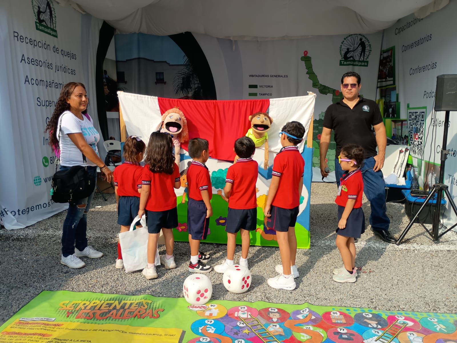 Continuando con las actividades en el stand de la CODHET en la Feria Tamaulipas 2025, se recibió la visita de niñas y niños de nivel primaria, quienes participaron en actividades lúdicas y educativas organizadas por este Organismo, las y los infantes tuvieron la oportunidad de interactuar con los personajes Codhetín y Codhetina, quienes les compartieron información sobre los derechos de las niñas, niños y adolescentes, promoviendo valores como el respeto, la igualdad y la empatía. Asimismo, disfrutaron del juego de serpientes, adaptado con mensajes alusivos a la importancia de conocer y ejercer sus derechos, fomentando el aprendizaje a través del juego y la participación. Estas acciones forman parte del programa permanente de difusión que la CODHET desarrolla en coordinación con distintas instituciones educativas, con el propósito de fortalecer la cultura de los derechos humanos desde la infancia.
