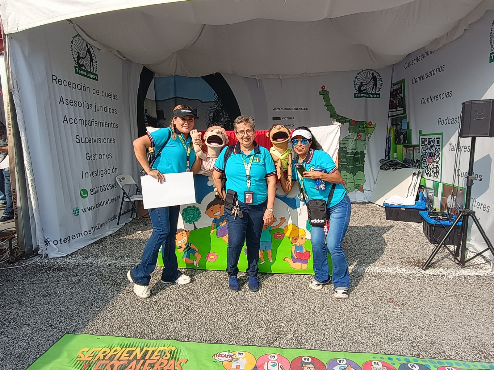 Continuando con las actividades en el stand de la CODHET en la Feria Tamaulipas 2025, se recibió la visita de niñas y niños de nivel primaria, quienes participaron en actividades lúdicas y educativas organizadas por este Organismo, las y los infantes tuvieron la oportunidad de interactuar con los personajes Codhetín y Codhetina, quienes les compartieron información sobre los derechos de las niñas, niños y adolescentes, promoviendo valores como el respeto, la igualdad y la empatía. Asimismo, disfrutaron del juego de serpientes, adaptado con mensajes alusivos a la importancia de conocer y ejercer sus derechos, fomentando el aprendizaje a través del juego y la participación. Estas acciones forman parte del programa permanente de difusión que la CODHET desarrolla en coordinación con distintas instituciones educativas, con el propósito de fortalecer la cultura de los derechos humanos desde la infancia.
