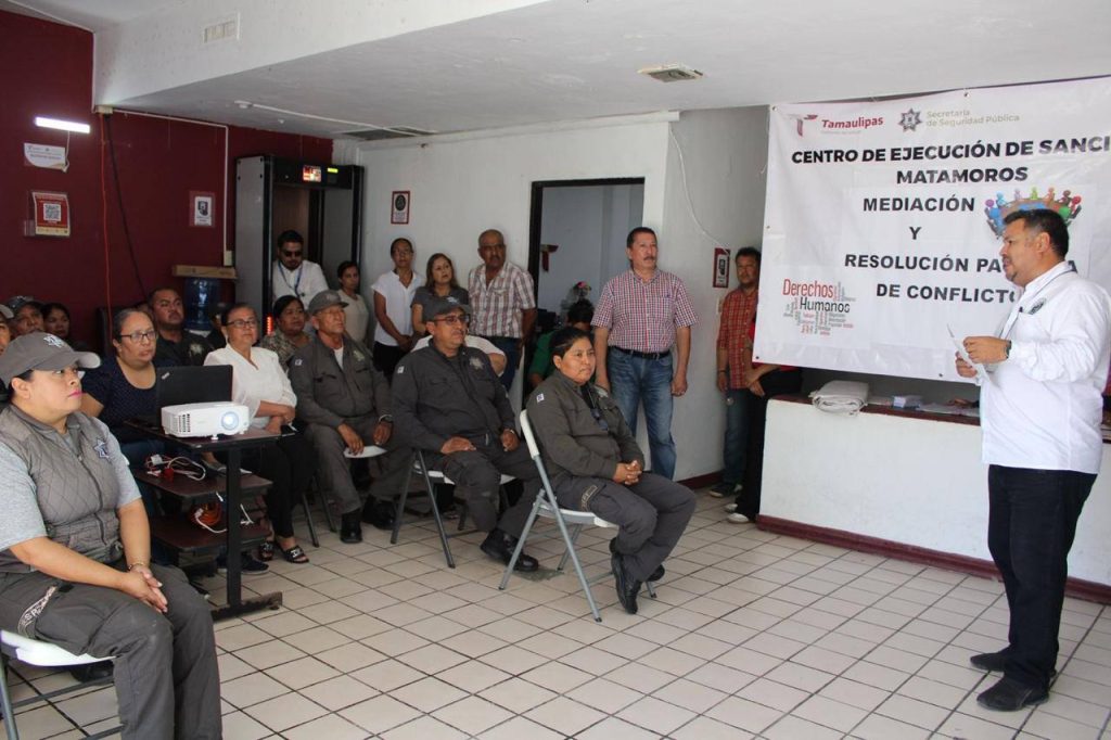 Con el objetivo de promover mecanismos alternativos para la solución de diferencias y fomentar una cultura de paz, personal de la Delegación Regional en Matamoros de la Comisión de Derechos Humanos del Estado de Tamaulipas impartió la conferencia “Mediación y resolución pacífica de conflictos”, dirigida al personal del Centro de Ejecución de Sanciones de Matamoros.
