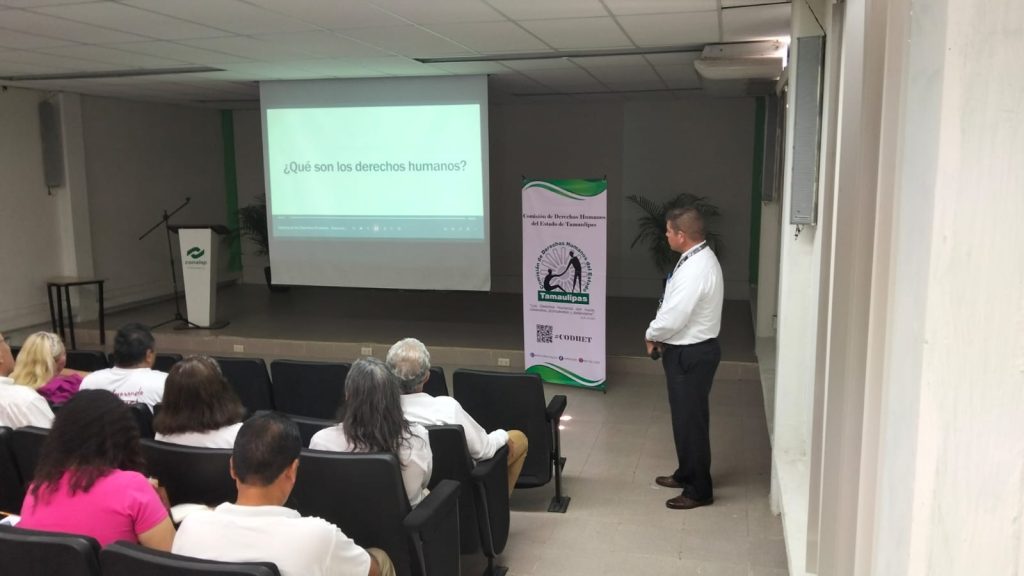 Se llevo a cabo conferencia con el tema “Curso Básico de Derechos Humanos», dirigida al personal docente y administrativo del Colegio Nacional de Educación Profesional Técnica de El Mante, Tamaulipas, dicha capacitación fue impartida personal de la Delegación Regional Mante de la CODHET. El objetivo de esta actividad fue fortalecer los conocimientos del personal educativo sobre los principios fundamentales de los derechos humanos, promoviendo su aplicación en el ámbito escolar y fomentando entornos de respeto, inclusión y convivencia armónica. Con estas acciones, este organismo reafirma su compromiso con la formación y sensibilización de quienes contribuyen a la educación y desarrollo integral de las y los jóvenes tamaulipecos, impulsando el respeto a la dignidad humana en todos los espacios educativos.