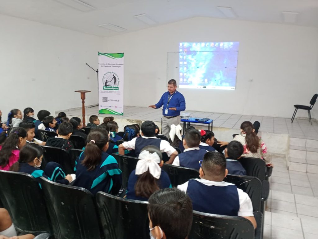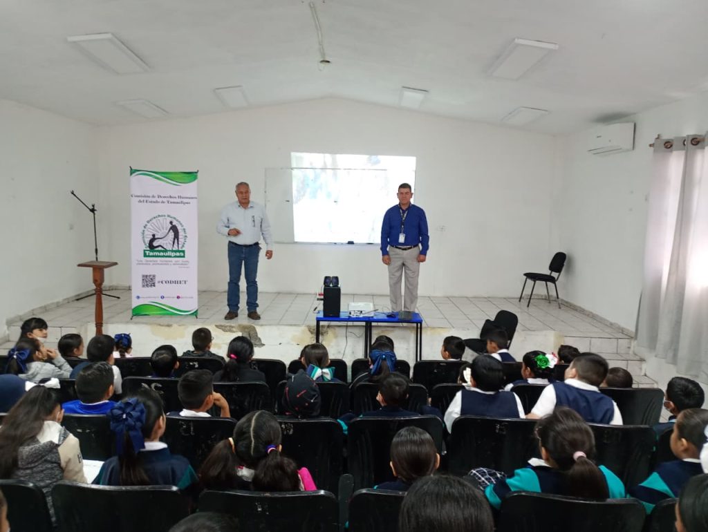 Se llevo a cabo la plática “El Bullying no es un juego” dirigida a los alumnos de la Esc. Prim. “Margarita Maza de Juárez”, en El Mante, Tamaulipas, impartida por personal de la Delegación Regional Mante de la CODHET; dicha actividad tuvo objetivo concientizar a niñas y niños sobre la importancia del respeto, empatía y convivencia pacífica, promoviendo la prevención de la violencia escolar, fortalecimiento de una cultura de paz y derechos humanos en el ámbito educativo.